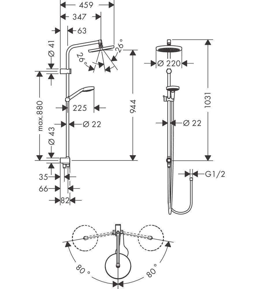 מוט משולב קומפלט עם ראש גשם 220 מ"מ, מזלף 3 מצבים כרום וצינור 160 ס"מ 26759400 HANSGROHE