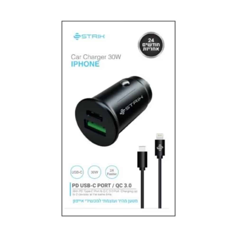 מטען מהיר 30W | כולל כבל TYPE – C | מתחבר למצית | חיבורים: USB , TYPE – C | מטעין 2 מכשרים בו זמנית | התמונה להמחשה בלבד