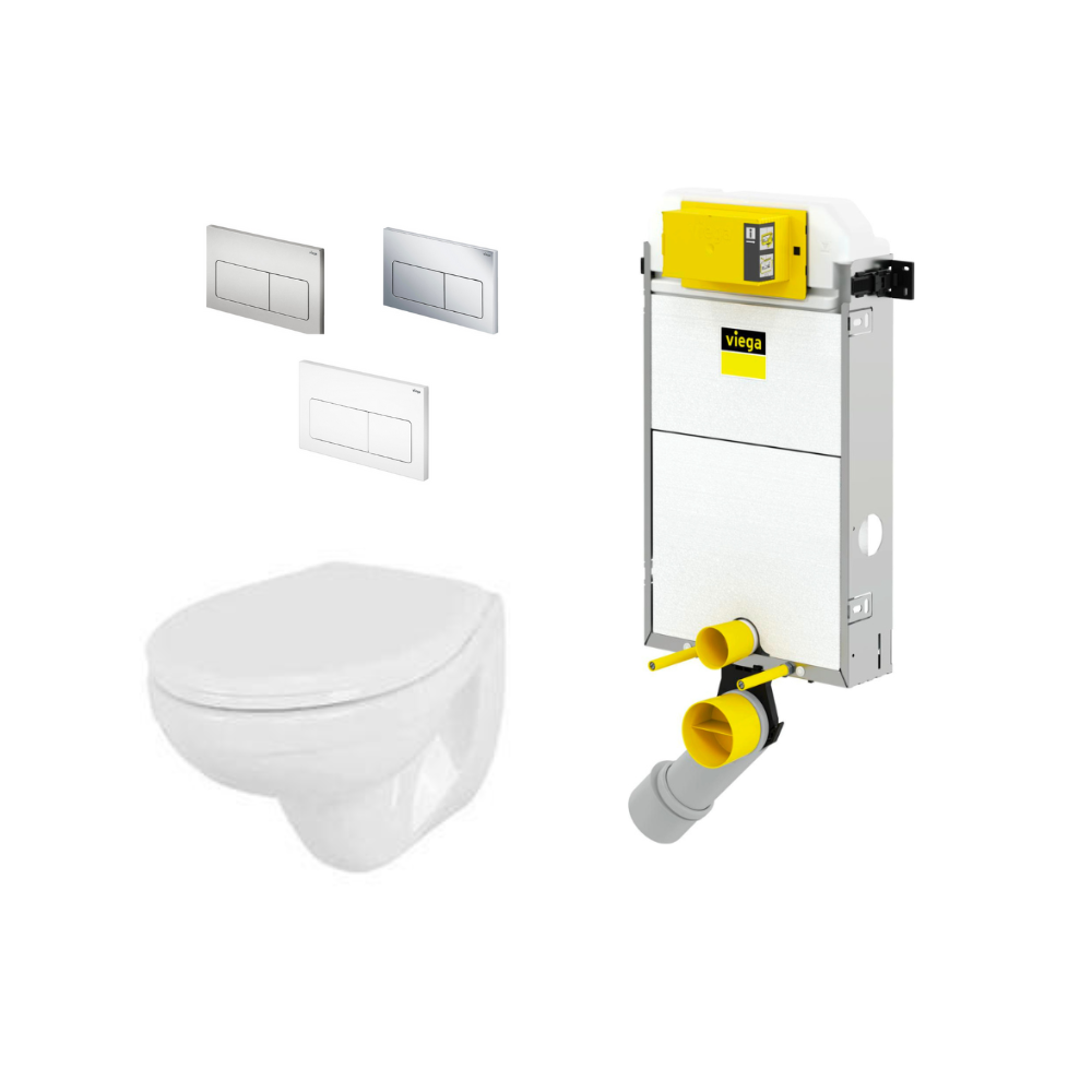 מיכל הדחה סמוי VIEGA כולל לחצן, אסלה תלויה ומושב אסלה